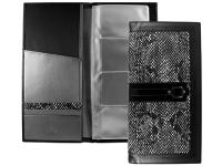 Визитница Elisir, коллекция "Амбиция сер." с пряжкой и риветами Swarovski, из натуральной кожи. Лист на 4 визитки. Внутри полукарман из кожи, 3 кармана для кредиток, пластиковый блок на 96 визиток. Упакована в подарочную коробку с тиснением Elisir. Размеры (XxYxZ): 113х130х25